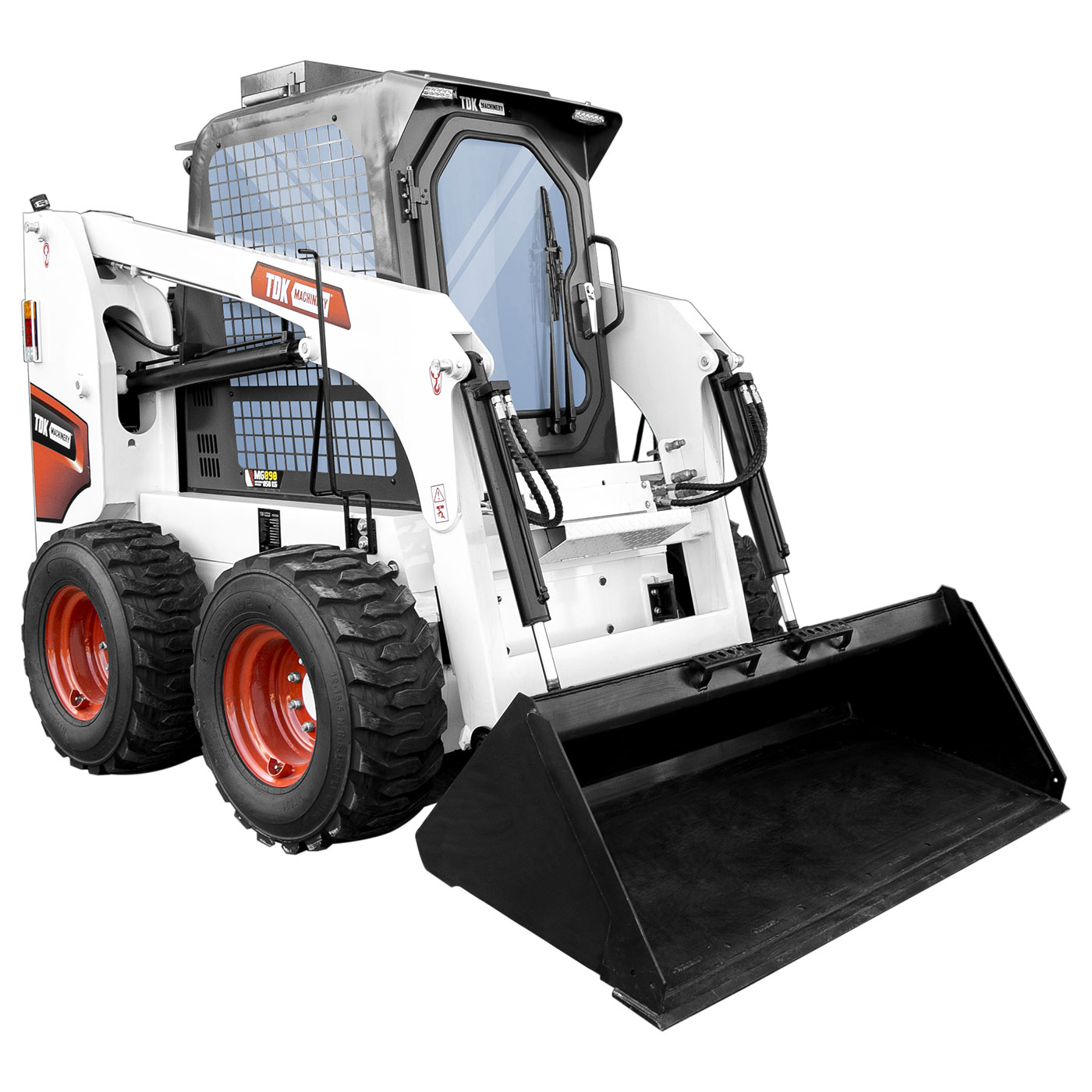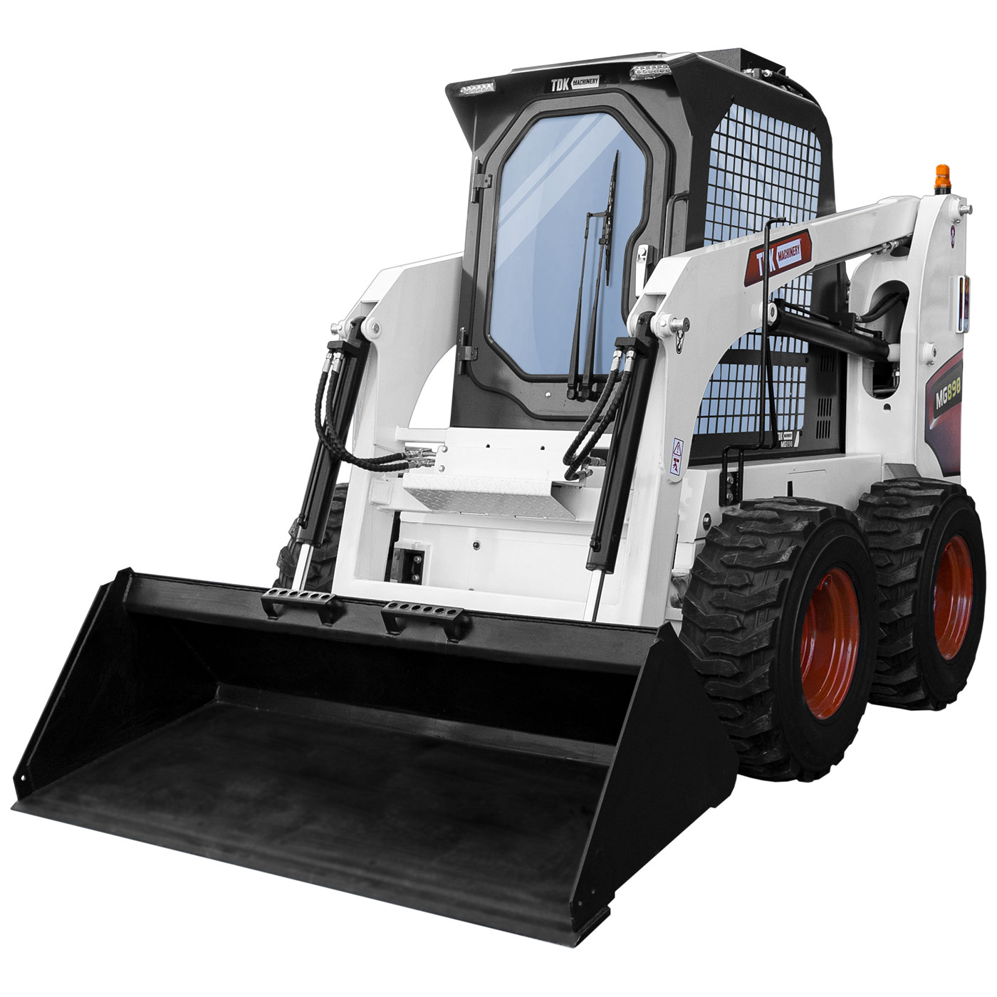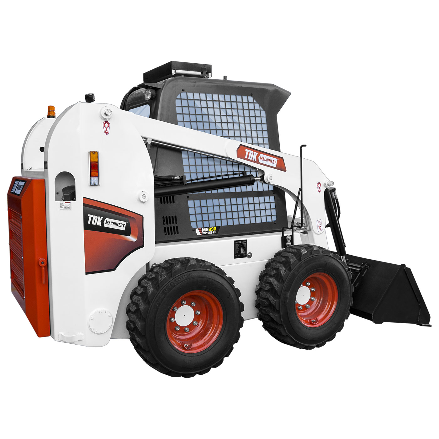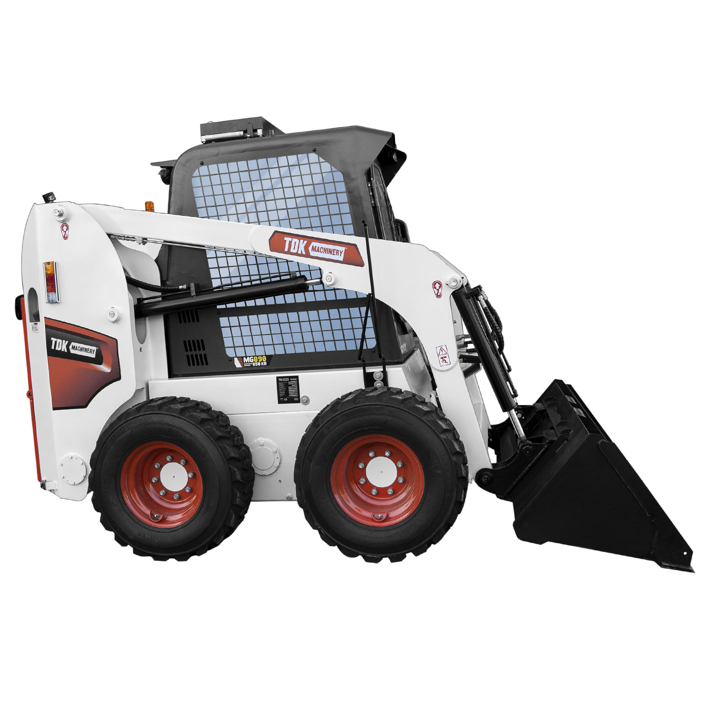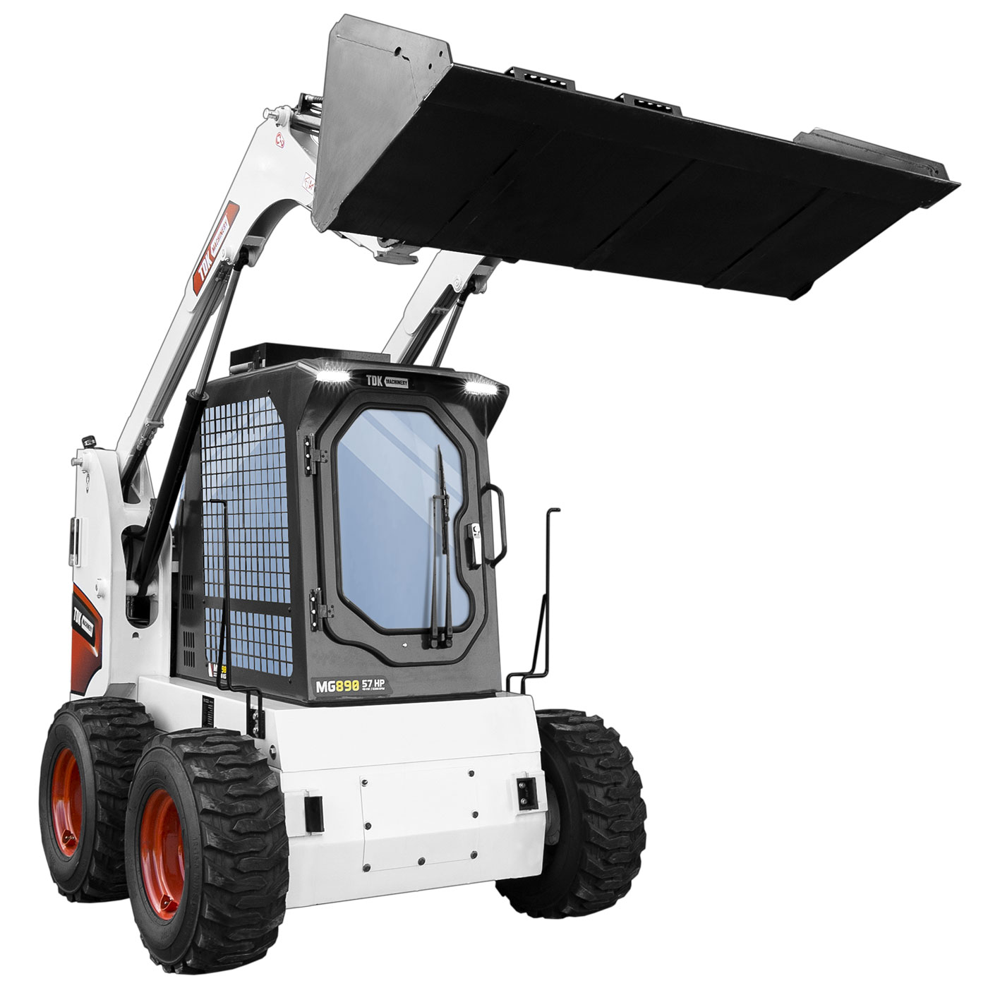 NUEVO Mini cargador sobre ruedas Profesional con motor diésel y potencia de 57 hp (43 Kw), alertas de niveles de aceite marca TDK MACHINERY. Consumo de diésel 7 litros por hora. Capacidad operativa nominal 850 kg. Carga de vuelco 1,700 kg. Volumen del cucharón 0.45-0.5 m3. Peso operativo 3,300 kg. Velocidad máxima 12 km/h. EQUIPAMENTO: Sistema eléctrico de 12 voltios. Interruptor de llave de encendido para arranque y parada. Luces: iluminación de fondo de los medidores, dos luces traseras, dos luces delanteras ajustables, luz de techo. Alarma de retroceso. Bocina. Acelerador de mano (dial), electrónico. Controles de la palanca universal ajustables. ADICIONALES: Sistema de control manual (mecánico). Cucharón standard. Acopladores auxiliares hidráulicos. Cabina climatizada. Asiento de vinilo ajustable. Posabrazos abatible anatómico y ergonómico. Cabina con estructura ROPS. FOPS (Estructura de protección contra la caída de objetos). TREN DE FUERZA: Motor diésel con compresor. Filtro de aire, elemento doble, sello radial. Filtros, tipo cartucho, hidráulicos. Radiador/enfriador de aceite hidráulico. Frenos de estacionamiento, accionados por resorte y desconectados hidráulicamente. Tracción en las cuatro ruedas. El sistema hidráulico cuenta con excelentes fuerzas de levantamiento y desprendimiento. El ventilador proporcional a la demanda continua ofrece mejor eficiencia del combustible y mayor potencia. El elevado vertical proporciona mayor alcance y altura de levantamiento para manipulación de materiales o para facilitar y agilizar la carga en camión. Un diseño modular de cabina sellada y presurizada de calidad para un entorno de operación más limpio y silencioso.